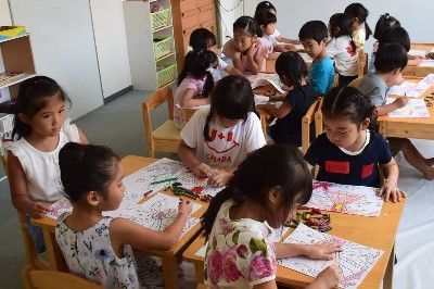 延長時間中はおやつを食べたり、日本人アシスタントと一緒に塗り絵やワークシートなどをして過ごします。